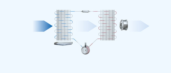 The dried air is reheated while the refrigerant releases heat.